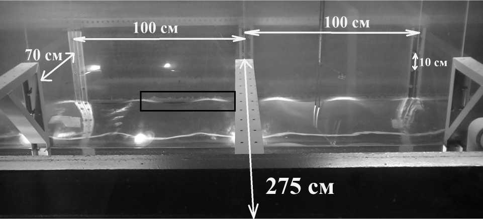 Для измерений описываемым способом нужно знать расстояние до измеряемой волны и угол зрения камеры на спокойную воду. Высота камеры над уровнем воды в канале — 105 см, расстояние по горизонтали от камеры до передней стенки канала — 275 см, ширина канала — 70 см, расстояние между болтами крепления стенки канала — 10 см. Для наглядности размеры отмечены на кадре из видео на рис. 1.