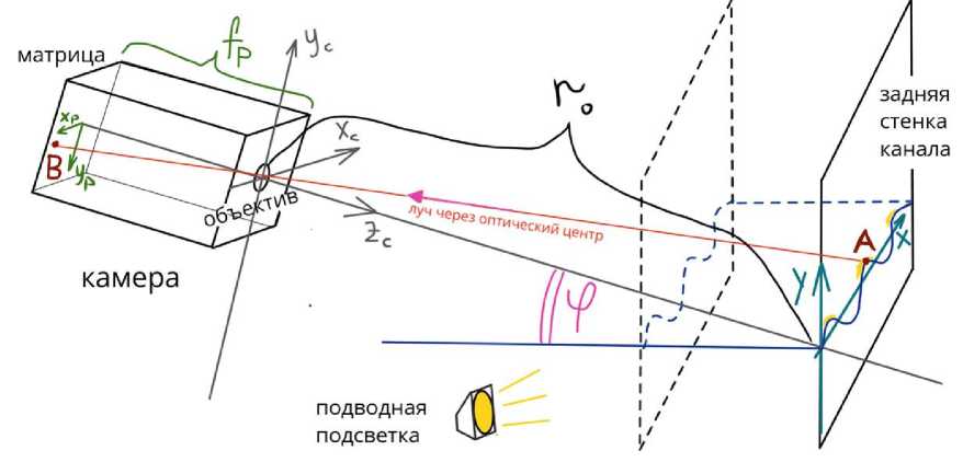 X = X c , У с = y cos V, Z c = Г - y sin V, (2) где r 0 = 3.6 м — расстояние от камеры до уровня спокойной воды на задней стенке по центру кадра, φ — угол между осью z c и нормалью к стенке (совпадает с углом наклона камеры к горизонту). Тогда координаты на стенке бассейна можно вычислить, зная координаты пикселя на матрице следующим образом: