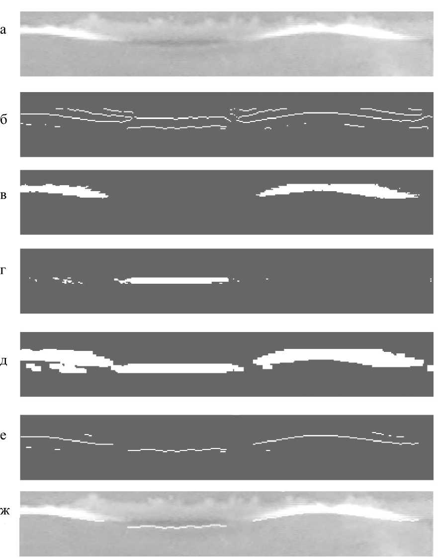 Для сужения области поиска краевых пикселей, которые действительно являются границей воды, применяется логическое "И" (7) между краями, обнаруженными методом LoG (5) и маской яркости (6). На рис. 3, е, изображен результат этой операции, т.е. те белые пиксели из рис. 3, б, которые попадают в белую область на рис. 3, д: