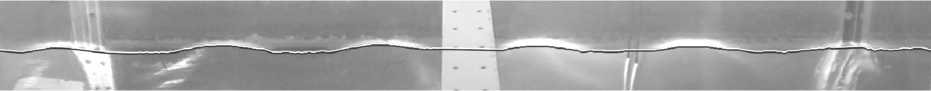 Граница области поверхности воды восстанавливается в пропущенных местах с помощью интерполяции Акимы [9], которая в данном случае лучше сплайн-интерполяции, т.к. более устойчива к выбросам. Также, чтобы избавиться от выбросов, слева и справа за краями кадра добавляется по две точки на уровне спокойной воды. На рис. 4 изображена интерполированная на всей наблюдаемой камерой области поверхность воды на фоне задней стенки канала.