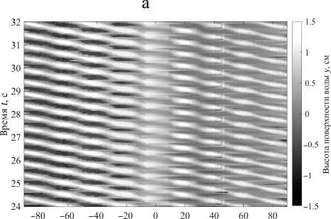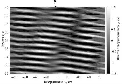 На рис. 5 представлена высота поверхности воды в зависимости от времени и горизонтальной координаты, пересчитанная из пикселей в сантиметры по формулам (3). На рис. 5, а, показаны ре- зультаты обработки эксперимента с поверхностными волнами частотой 2 Гц, без течения; на рис. 5, б, — результаты обработки эксперимента с поверхностными волнами частотой 1.4 Гц при наличии неоднородного течения. Картина для поверхностных волн без течения (рис. 5, а) регулярна: бегущие в одну сторону вершины волн - светлые параллельные наклонные линии. Заметны искажения, вызванные особенностью обработки в районе х = 0 см и x = 42 см, где задняя стенка загорожена балкой канала и волнографом соответственно. Белые и черные тонкие горизонтальные линии появляются при неправильной обработке области кадра алгоритмом, когда он "срывается" в блик на воде или на стенке канала.