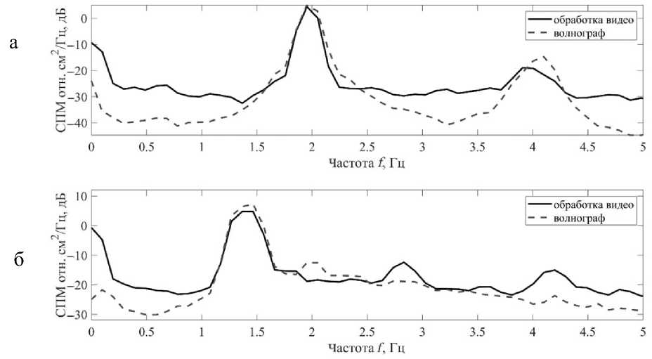 Рис. 6. Спектральные плотности мощности поверхностного волнения в точке, полученные при обработке видео и по записи сигнала волнографа.