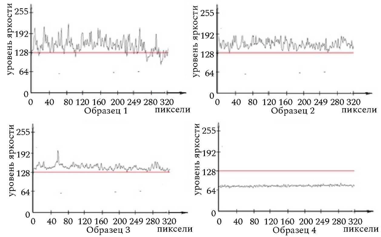 При этом микрорельеф образцов 1 и 2 (рис. 1) был сформирован шлифованием, а микрорельеф образцов 3 и 4 ‒ полированием. Определенные с помощью профилометра SJ-201P (Mitutoyo, Япония) параметры шероховатости Ra микрорельефов поверхностей указанных образцов 1–4 составили 0,13; 0,084; 0,048; 0,025 мкм соответственно [11]. Характерные видеосигналы по строке видеокадра приведенных изображений исследуемых микрорельефов показаны на рис. 2.