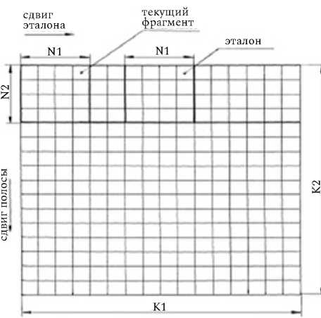 В полутоновом изображении с первой строки выделяется полоса шириной N 2 пикселей и по центру этой полосы задается эталон размером N 1× N 2 пикселей. Затем эталон, начиная с крайней левой позиции, перемещается по выделенной полосе с шагом в 1 пиксель. При каждом совмещении эталона и текущего фрагмента изо-