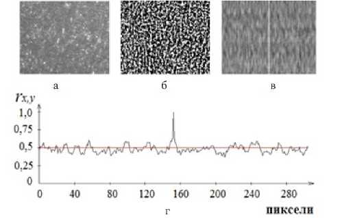 Рис. 6. Полутоновое ( а ) и бинарное ( б ) изображения поверхности выбранного участка, корреляционная поверхность ( в ) и график изменения коэффициента корреляции для этого участка ( г )