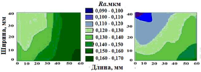 Далее, было выполнено последовательное оптико-электронное сканирование всей поверхности спинки и корыта лопатки, вычисление Ra для каждого участка и построение полей шероховатости, представленных на рис. 7. Из приведенных данных видно, что шероховатость на поверхности спинки больше, чем на корыте на 0,15-0,2 мкм. Это связано с тем, что при обработке площадь контакта поверхности лопаток с ложементами с течением времени меняется и давление на спинке повышается. Кроме этого, лопатка в процессе обработки совершает колебание не по плоскости, а по некоторой дуге, которая не всегда совпадает с радиусом закрутки лопатки, поэтому формирование микронеровностей в большей степени зависит от кинематики процесса виброконтактного полирования.