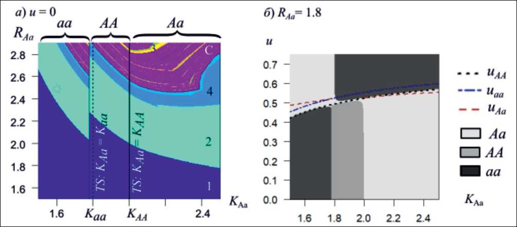 Отметим, что в случае равенства приспо- собленностей всех генотипов: wj =1 + R(1 — x/K) модель (1) представляет собой дискретный аналог модели Ферхюльста: xn+1 = axn(1 — xn/M). Корректность данной модели (x ≥ 0) сохраняется при выполнении следующих условий а а > 2 + 2-^2 [3]. Таким образом, это накладывает на параметры и начальные условия модели (1) следующие ограничения: Rij< 3 и xо Величина изъятия («урожай») в n-м поколении составляет Rn = u • xn • wn. В соответствии с концепцией оптимального промысла необходимо определить уровень изъятия из популяции, который обеспечивает стабильный максимальный равновесный промысловый «урожай» при условии невырождения популяции. Система (1) имеет три равновесных решения: два мономорфных ({q=0, x=x 1} и {q = 1, x = x2}) и одно полиморфное {q = q3, x = x3}. Из первого уравнения системы (1) можно выразить долю изъятия u: u = 1 -1/ w и получить выражение, определяющее объем изъятия в виде: R = x • w • u = x • w — x. Для того чтобы промысел с постоянной долей изъятия был оптимальным, необходимо вы- 5R полнение условия: дx x = x = 0, следовательно, w + x • wx'—1 = 0. Далее были определены значения численности и оптимальные доли изъятия в каждом нетривиальном равновесии системы (1), а также проанализированы условия их устойчивости. Оказалось, что стационарные значения частот аллелей в состояниях, обеспечивающих максимальный уровень изъятия, остаются такими же, как и в случае, когда промысел отсутствует, а равновесные значения численности уменьшаются в два раза. Кроме того, аналитически показано, что при оптимальном изъятии, соответствующем отдельному равновесию, данная неподвижная точка всегда имеет одно собственное значение, не превосходящее единицы по модулю. Второе определяется взаимным расположением приспособленности гетерозиготы и гомозигот при соответствующем данному равновесию уровне численности xi. Мономорфная стационарная точка оказывается устойчивой, если в данном промысловом равновесии приспособленность соответствующей гомозиготы больше приспособленности гетерозиготы; а полиморфное равновесие оказывается устойчивым, если приспособленность гетерозиготы больше приспособленностей обеих гомозигот при соответствующем промысловом равновесном значении численности популяции. С этим связано проявление эффекта смены типа генетического равновесия в результате неизбирательного промысла (пример на рис. 1). Так полиморфная популяция в результате промысла может утратить своё генетическое разнообразие, а мономорфная, наоборот, сохранить. Отметим, что каждая из найденных долей изъятия uij является оптимальной только для соответствующего ей равновесия. Для других неподвижных точек данный уровень изъятия является произвольным. В результате динамика численности популяции стабилизируется на равновесном уровне, если система оказывается в области притяжения этого равновесия. Поскольку для других двух неподвижных точек системы (1) текущий уровень изъятия в общем случае не удовлетворяет условиям оптимальности при попадании в их область притяжения, динамика численности популяции может продолжить флуктуировать, поскольку одно из собственных чисел текущего равновесия системы (1) может превосходить единицу по модулю. Поэтому вариация начальных условий может менять как результат эволюции промысловой популяции, так и её динамический режим. Рис. 1. (а) Карта д