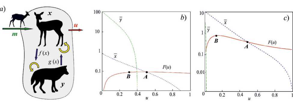 Первый случай (рис. 1b) отражает ситуацию, при которой на рассматриваемой территории существует популяция крупной жертвы (напри- мер, северный олень, изюбр и т.д.), масса тела которых превосходит массу тела хищника (например, волка). В этом случае хищнику требуется относительно небольшой объем жертв, а устойчивое развитие сообщества возможно даже при небольшом превышении численности хищника над численностью жертв. Очевидно, в системе (1) это возможно из-за постоянного притока новых особей с сопредельных территорий (медленного восстановления). Благодаря этому даже существенная доля промыслового изъятия (u < 0.5) жертвы не способна дестабилизировать общую динамику сообщества. В этом случае существует доля изъятия (точка В на рис. 1b), обеспечивающая максимальный доход от промысла при сосуществовании обоих видов. В результате промысла текущая стационарная численность жертвы плавно снижается, так как восполнение ее биомассы происходит очень медленно. Хищник при этом быстро реагирует на изменение численности жертв, что приводит к резкому уменьшению его численности. Увеличение объема промысла (превосходящего долю оптимального изъятия (точка В)) способствует уменьшению биомассы жертв ниже уровня, необходимого для пропитания хищников, что приводит к вырождению их популяции. Другими словами, кривая объема изъятия F(u) имеет насыщение в точке В, после которой увеличение доли изымаемых особей не приводит к увеличению объемов промысла (доход), однако приводит к резкому падению численностей обеих популяций. Если же доля изъятия не превышает этого значения, то промысел будет стабилизировать общую динамику системы (1). При значительном превышении доли изъятия сверх оптимального значения численность жертв падает до труднодоступного уровня, что, в свою очередь, ведет к вырождению популяции хищника.