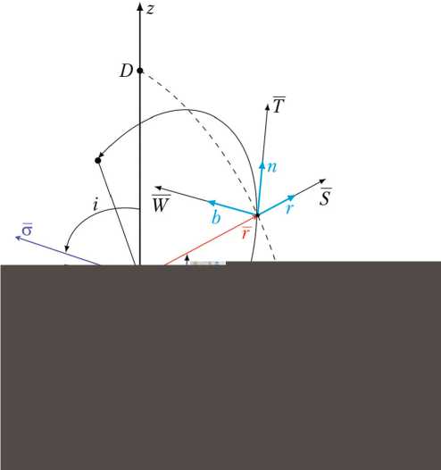 Рис. 2. Связь между геоцентрической экваториальной и орбитальной системами координат: r, n, b — рад–иаль–-ное, трансверсальное и бинормальное направления; T, S, W — проекции возмущающего ускорения на оси орбитальной системы координат; —r — радиус-вектор; u — аргумент широты; i — наклонение орбиты; Ω — долгота восходящего узла; — σ — вектор площадей (рисунок создан авторами)