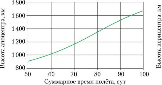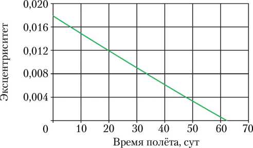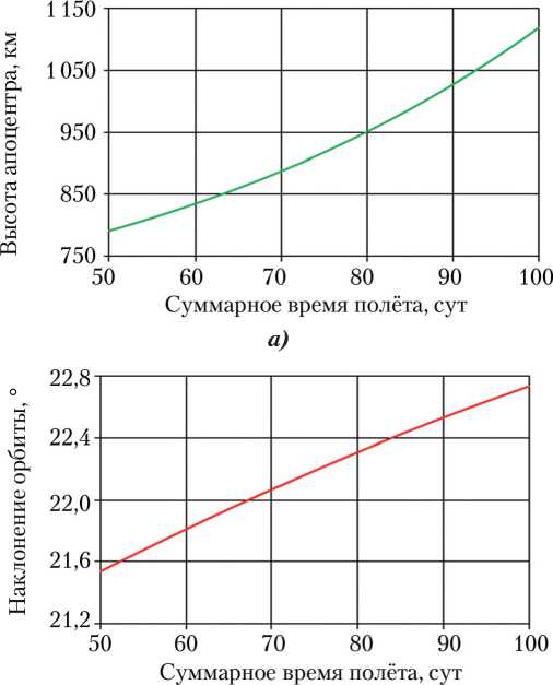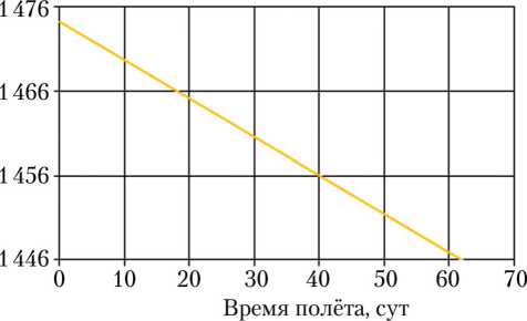 На рис. 7 представлена эволюция параметров оскулирующей перелётной орбиты и изменения массы КА во времени для оптимального решения. Время перелёта на целевую орбиту оказалось меньше на 1,5 сут по сравнению с ранее полученным приближённым решением, что обеспечило увеличение массы полезной нагрузки КА на целевой орбите на 2 кг.