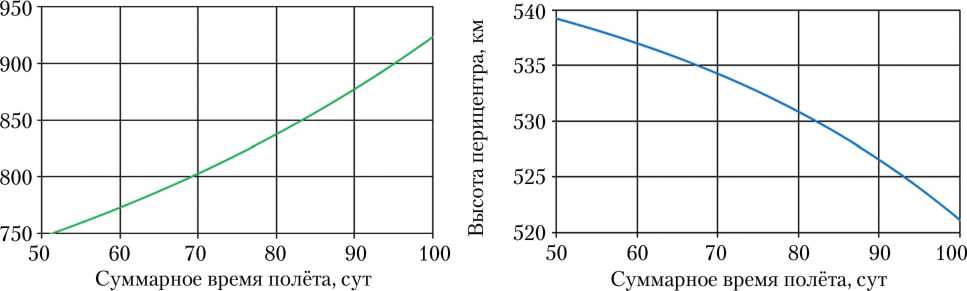 На рис. 3–5 представлены зависимости от длительности выведения оптимальных параметров промежуточной орбиты, а также конечной массы КА, полученные в результате решения задачи условной максимизации. Для всех рассмотренных комбинаций средств выведения наблюдаются следующие характерные изменения: высота перицентра ПО монотонно убывает на рассматриваемом временном промежутке, а высота апоцентра, наклонение и конечная масса возрастают. Причём конечная масса монотонно возрастает почти линейно.