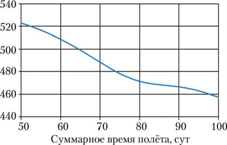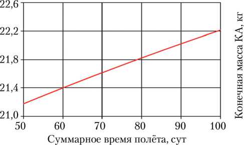 Используя интерполированные значения характеристической скорости, проводилась оценка массы КА, доставляемой на рабочую орбиту, а также времени перелёта. В результате были получены приближённые зависимости максимальной массы КА, доставляемой на рабочую орбиту, от времени перелёта, а также приближённые оптимальные параметры ПО.