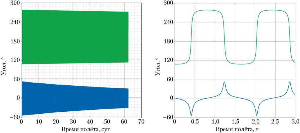 На рис. 6 представлен характер изменения углов тангажа и рыскания оптимального управления в течение полёта. Для удобства угол рыскания был нормирован в диапазоне 0^360°.