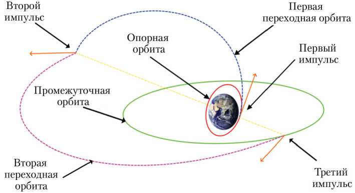 • третий импульс необходим для повышения радиуса перицентра переходного эллипса до радиуса конечной орбиты и изменения наклонения плоскости орбиты на оставшийся угол.