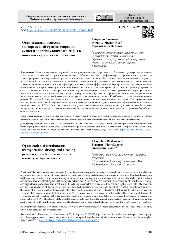 В представленной научной статье разработана и теоретически обоснована усовершенствованная конструкция шнековой сушилки-очистителя, обеспечивающая эффективную организацию процессов транспортировки, одновременной сушки и очистки хлопкового сырья. На основе анализа проведенных научных исследований определены значимость винтовых конвейеров в хлопковой промышленности, существующие технические ограничения и основные факторы, влияющие на их эффективность. В результате исследования создана возможность одновременной сушки и высокой очистки хлопка от мелких примесей в процессе транспортировки за счет оптимизации шага шнека, расположения и угла отклонения кольев, а также равномерного распределения давления и скорости системы подачи горячего воздуха по желобу шнека. В результате теоретических расчетов и экспериментальных испытаний выявлено, что при частоте вращения шнека 180 об/мин и угле отклонения кольев равном 8° ударный импульс минимален, что существенно снижает повреждаемость семян. Экспериментально подтверждено, что способ параллельной сушки и очистки горячим воздухом повышает эффективность отделения мелкого сора на 4–5%. Конструктивная схема установки оптимально распределяет ударные и колебательные импульсы куска хлопка при его движении по сетке, что повышает качество очистки и продлевает срок службы рабочих органов машины.