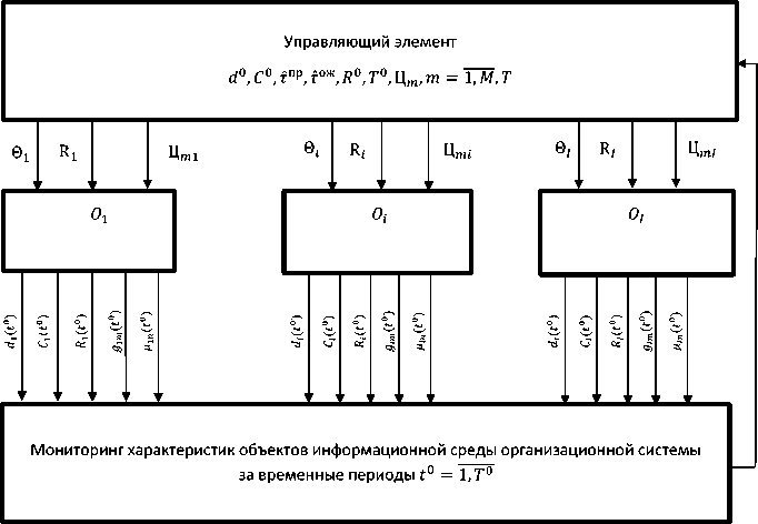 По резуль тата м мониторинга деятельности объектов Oi фиксируются за временные периоды t0 = 1, T ° значения характеристик R. ( t 0 ), d i ( t 0 ), c i ( t 0 ), интенсивностей потоков заказов и их обслуживания, надежности автоматизированных устройств: