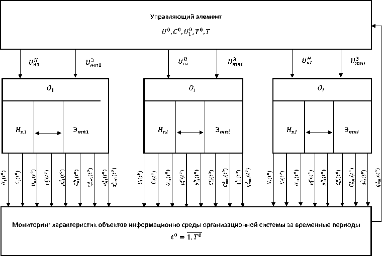 В случае отражения процесса обслуживания заказов в информационной среде управляющий центр взаимодействует с автоматизированными устройствами (неэргатически-ми элементами) и персо на лом (эргатическими элементами), связанными с функционированием объектов O i , i = 1, I . С этой целью управляющим центром устанавливаются требования по количеству обрабатываемых заявок на обслуживание ( U 0); затратам ( C 0); количеству невыполненных заказов ( U 01).