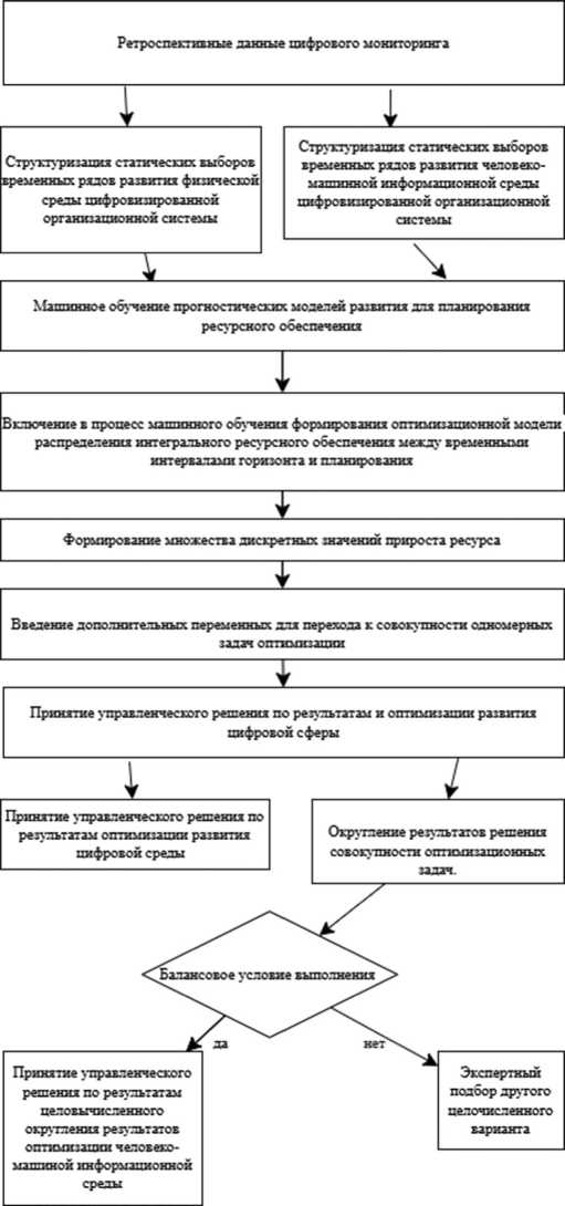Работа посвящена формированию моделей и алгоритмических процедур оптимизации эффективности цифровизированной организационной системы обслуживания заказов потребителей на стадии развития. Исходя из структурных моделей физической и информационных сред, реализующих процесс обслуживания на базе автоматизированного оборудования и устройств, проведена структуризация функционирования организационной системы в виде временных рядов, позволяющих осуществлять машинное обучение прогностических моделей. Обоснована организация интеллектуальной поддержки решений управляющего центра, направленных на распределение интегрального ресурса развития между временными периодами в рамках горизонта планирования с требованием роста показателей эффективности и учетом возможностей имитационного моделирования в процесс машинного обучения. В этом случае формирование прогностических моделей нацелено на установление зависимостей экстремальных требований от значений оптимизируемых переменных и временных периодов, что приводит к многомерной оптимизационной модели. Показана целесообразность перехода от многомерной постановки к совокупности одномерных задач оптимизации, на основе решения которых для каждого временного интервала принимается управленческое решение по объему ресурсного обеспечения с учетом выполнения балансового условия.