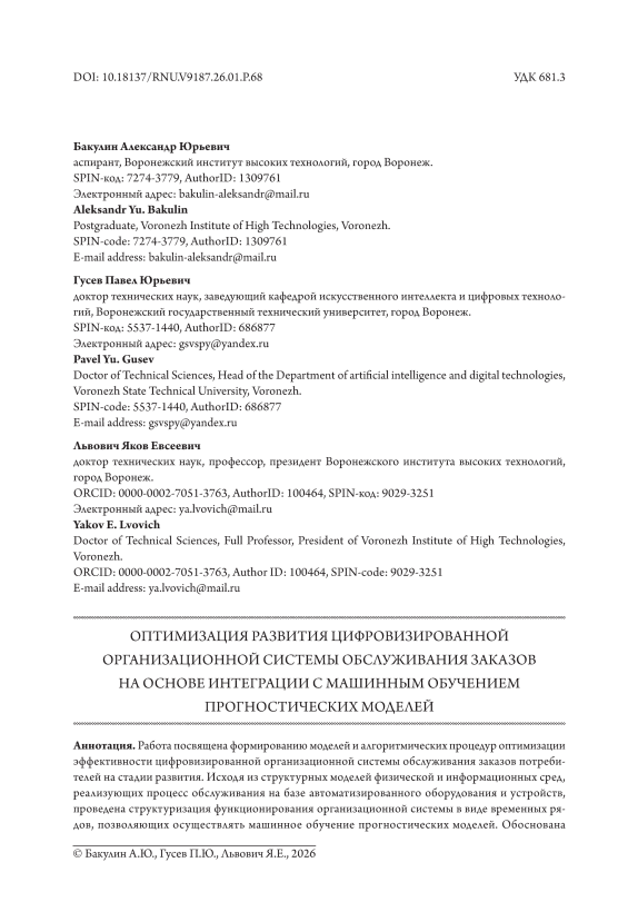 Оптимизация развития цифровизированной организационной системы обслуживания заказов на основе интеграции с машинным обучением прогностических моделей