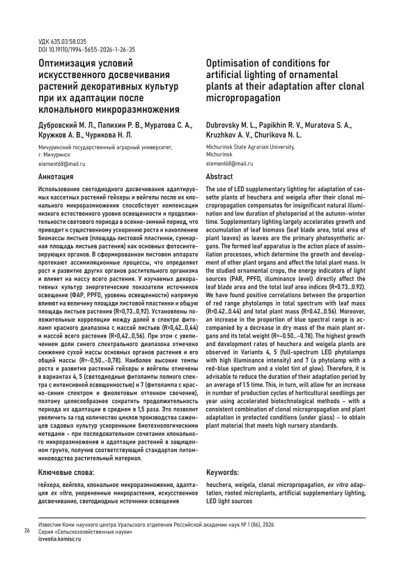 Использование светодиодного досвечивания адаптируемых кассетных растений гейхеры и вейгелы после их клонального микроразмножения способствует компенсации низкого естественного уровня освещенности и продолжительности светового периода в осенне-зимний период, что приводит к существенному ускорению роста и накоплению биомассы листьев (площадь листовой пластинки, суммарная площадь листьев растения) как основных фотосинтезирующих органов. В сформированном листовом аппарате протекают ассимиляционные процессы, что определяет рост и развитие других органов растительного организма и влияет на массу всего растения. У изучаемых декоративных культур энергетические показатели источников освещения (ФАР, PPFD, уровень освещенности) напрямую влияют на величину площади листовой пластинки и общую площадь листьев растения (R=0,73…0,92). Установлены положительные корреляции между долей в спектре фитоламп красного диапазона с массой листьев (R=0,42…0,44) и массой всего растения (R=0,42…0,56). При этом с увеличением доли синего спектрального диапазона отмечено снижение сухой массы основных органов растения и его общей массы (R=-0,50…-0,78). Наиболее высокие темпы роста и развития растений гейхеры и вейгелы отмечены в вариантах 4, 5 (светодиодные фитолампы полного спектра с интенсивной освещенностью) и 7 (фитолампа с красно-синим спектром и фиолетовым оттенком свечения), поэтому целесообразнее сократить продолжительность периода их адаптации в среднем в 1,5 раза. Это позволит увеличить за год количество циклов производства саженцев садовых культур ускоренными биотехнологическими методами – при последовательном сочетании клонального микроразмножения и адаптации растений в защищенном грунте, получив соответствующий стандартам питомниководства растительный материал.