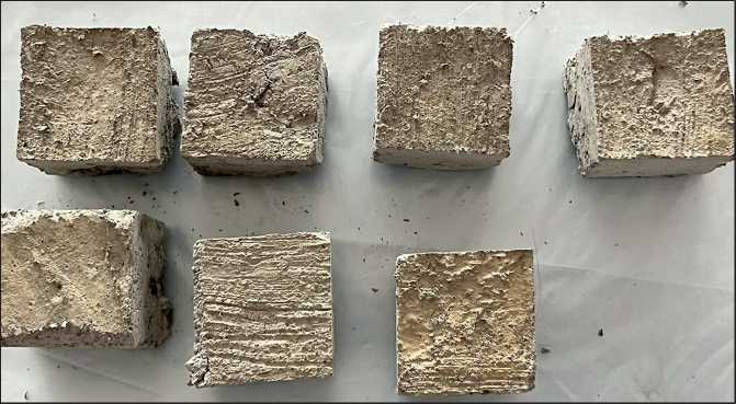 The resulting ceramic composite, manufactured using a semi-dry pressing method, confirms that when the barite powder content exceeds 20%, the structure of the composite begins to degrade (see Table 11 and Figure 14). The ceramic composite samples are presented in Figures 15 and 16.