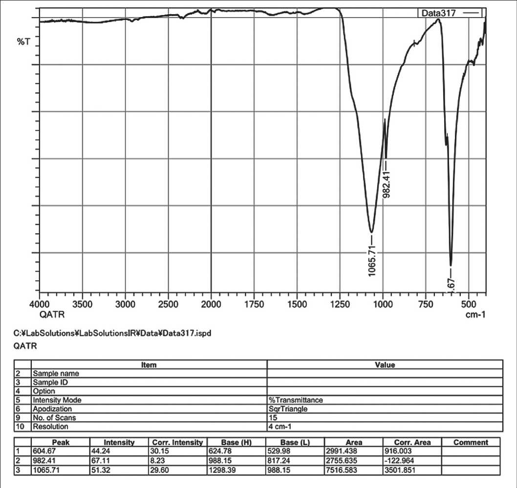 The chemical composition of the barite from the Arsy deposit was studied using atomic emission spectrometry, X-ray fluorescence analysis, and silicate chemical analysis. The X-ray diffraction analysis was performed on an AL-27MINI diffractometer in the 2θ range from 10° to 70°. The scan rate was 4°/min with a step size of 0.04°. The operating voltage and current were 30 kV and 10 mA, respectively. Fourier-IR spectra were recorded using an IRSpirit-T spectrometer equipped with a QATR-S attachment, in the range of 400–4000 cm–1. Background correction was performed before each recording to eliminate atmospheric distortions.