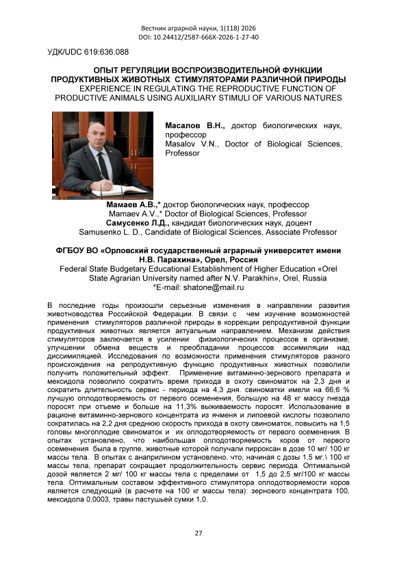 Опыт регуляции воспроизводительной функции продуктивных животных стимуляторами различной природы