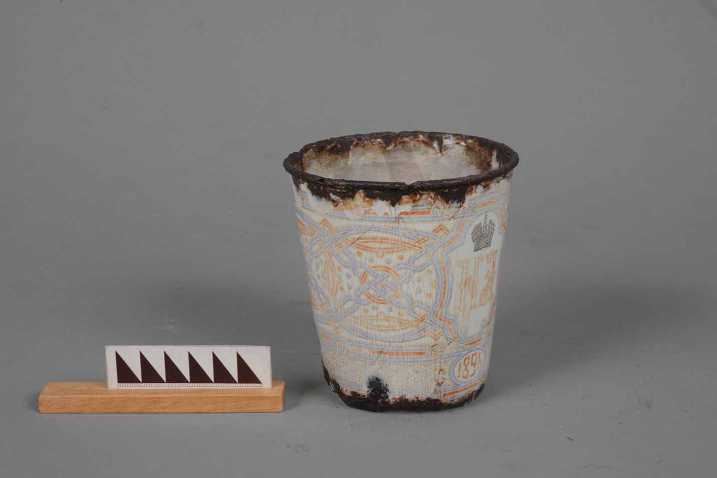 Экспонат с трагической историей поступил в тяжелом состоянии: утрата дна, коррозия металла, деструкция и локальные утраты эмали, практически не осталось металлизированного декоративного покрытия. Стакан (в некоторых источниках: кружка или чарка) входил в подарочный набор по случаю коронации Николая Второго. Всего было приготовлено 400 узелков с сувенирами, и именно они стали причиной страшной давки на Ходынском поле.