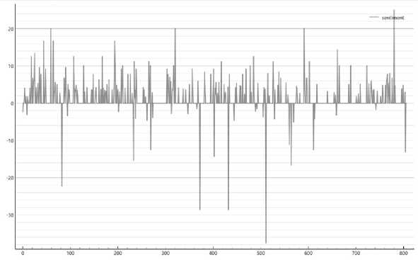 После проведения сентимент-анализа все токены были оценены алгоритмом следующим образом: 0 — нейтральные, положительные числовые значения — положительные по сентименту предложения, отрицательные числовые значения — отрицательные по сентименту предложения.