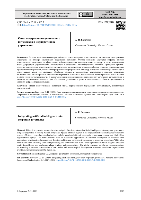 В статье представлен всесторонний анализ опыта внедрения искусственного интеллекта в корпоративное управление на примере крупнейших российских компаний. Особое внимание уделяется эффекту влияния искусственного интеллекта на эффективность бизнес-процессов, стандартизацию процедур, а также возникающие риски деградации управленческих компетенций и ослабления организационной гибкости. Приведены примеры успешного применения искусственного интеллекта для автоматизации документооборота, принятия инвестиционных и управленческих решений, повышения прозрачности корпоративных процедур. Показано, что несмотря на очевидные преимущества, такие как ускорение обработки данных и минимизация человеческого фактора, чрезмерная алгоритмизация может привести к снижению творческого потенциала руководителей и формированию новых вызовов в сфере этики и ответственности. В заключение даны рекомендации по гармоничному сочетанию автоматизации и развития человеческого капитала для обеспечения устойчивого роста и конкурентоспособности организации в условиях цифровой трансформации.