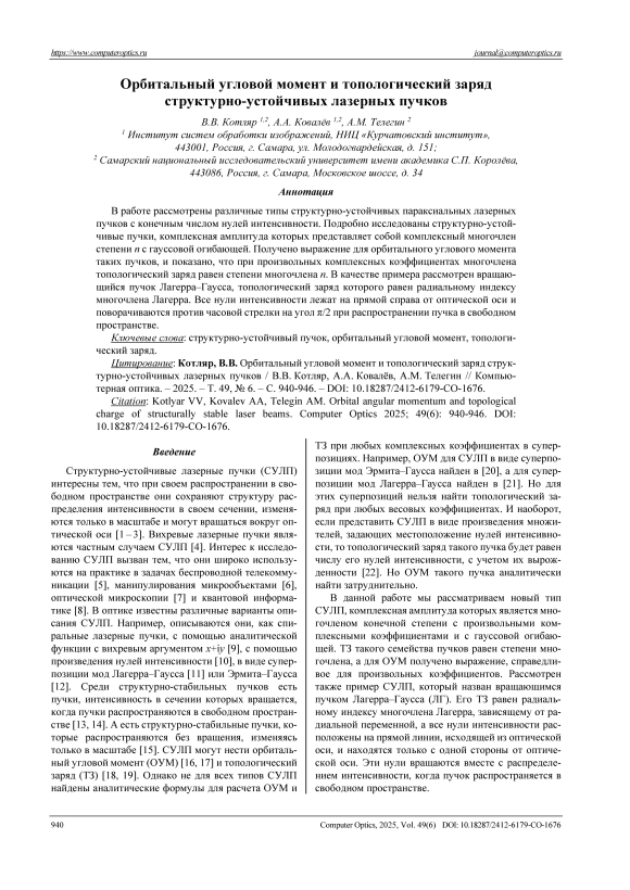 Структурно-устойчивый пучок, орбитальный угловой момент, топологический заряд