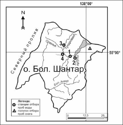 Работы проводились в 2017–2018 гг. на о. Б. Шантар, станции отбора (поверхностные воды, снежный покров) представлены на рис. 1.