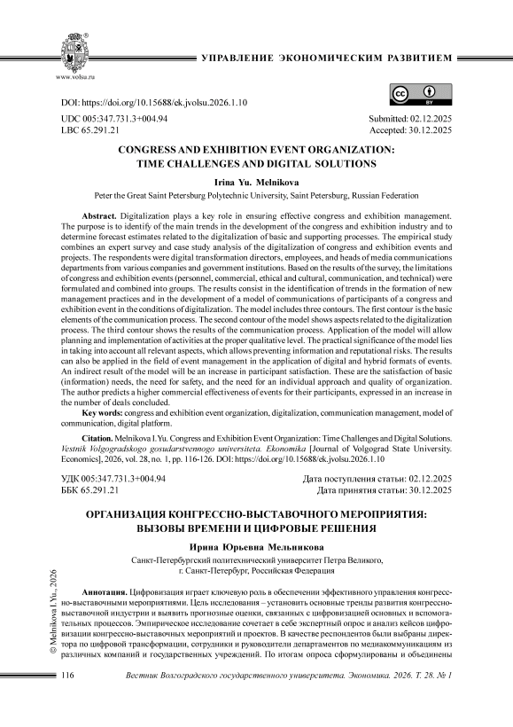 Цифровизация играет ключевую роль в обеспечении эффективного управления конгрессно-выставочными мероприятиями. Цель исследования – установить основные тренды развития конгрессновыставочной индустрии и выявить прогнозные оценки, связанных с цифровизацией основных и вспомогательных процессов. Эмпирическое исследование сочетает в себе экспертный опрос и анализ кейсов цифровизации конгрессно-выставочных мероприятий и проектов. В качестве респондентов были выбраны директора по цифровой трансформации, сотрудники и руководители департаментов по медиакоммуникациям из различных компаний и государственных учреждений. По итогам опроса сформулированы и объединены в группы ограничения конгрессно-выставочных мероприятий (кадровые, коммерческие, этико-культурные, коммуникационные и технические). Результаты заключаются в определении тенденций формирования новых управленческих практик и в разработке модели коммуникаций участников конгрессно-выставочного мероприятия в условиях цифровизации. Модель включает три контура. Первый контур – базовые элементы коммуникационного процесса. Второй – аспекты, связанные с процессом цифровизации. В третьем – результаты коммуникационного процесса. Применение модели позволит осуществлять планирование и реализацию мероприятий на должном качественном уровне. Практическая значимость модели заключается в учете всех значимых аспектов, что позволяет предотвратить информационные и репутационные риски. Также результаты могут найти применение в сфере событийного менеджмента при применении цифровых и гибридных форматов мероприятий. Косвенным результатом применения модели будет рост удовлетворенности участников. Речь идет о удовлетворении основных (информационных) потребностей, потребности в безопасности и потребности в индивидуальном подходе и качестве организации. Авторы прогнозируют более высокую коммерческую эффективность мероприятий для их участников, выраженную в росте числа заключаемых сделок.