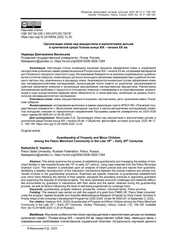 Настоящая статья посвящена изучению процесса оформления опеки и управления наследством купеческих семей дореволюционной России конца XIX – начала XX вв. на примере материалов дел Псковского городского сиротского суда. Исследование базируется на анализе сохранившихся судебных актов и отчетов опекунов, позволяющих детально воссоздать механизмы взаимодействия судебной инстанции и частных лиц, вовлеченных в процедуру опеки. Анализируются конкретные случаи оформления опеки над несовершеннолетними наследниками, происходящие после смерти их родителей, рассматривается практика назначения опекунов и организации распоряжения наследственным имуществом. Рассмотрены экономические проблемы и трудности в отношениях опекунов с опекаемыми и их родственниками, возникающие в ходе осуществления первыми своих обязательств, а также факторы, влияющие на уровень благополучия несовершеннолетних наследников.