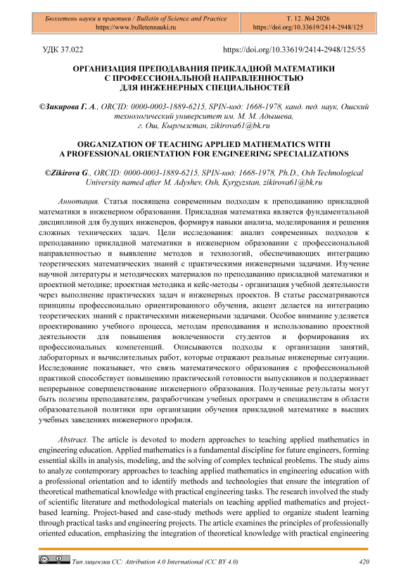 В ходе проведённого исследования была разработана и апробирована модель организации преподавания прикладной математики с профессиональной направленностью для студентов инженерных специальностей. Апробация осуществлялась на базе Ошский государственный университет в рамках дисциплин математического цикла. Внедрение профессионально-ориентированных заданий, элементов математического моделирования и междисциплинарной интеграции позволило выявить положительную динамику в формировании учебно-познавательной и профессиональной компетентности студентов.
