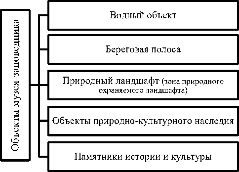 Проведенный авторами анализ современной литературы по тематике показал, что официально термин «музей-заповедник» закреплен в Федеральном законодательстве, где описывается как музей, которому принадлежат земельные участки с находящимися на них памятниками и достопримечательностям [2]. Важно отметить, что территориально музей-заповедник не ограничивается участками суши, но включает и водные зоны, на которых природный комплекс сохраняется в естественном состоянии.