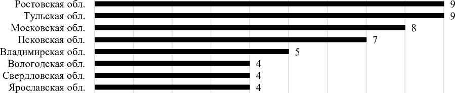 В России количество музеев-заповедников по состоянию на 2024 г. составляет 103 ед., большинство из которых находится в Ростовской и Тульской областях (рис. 2) [13].