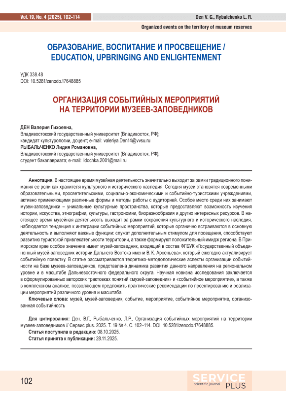 В настоящее время музейная деятельность значительно выходит за рамки традиционного понимания ее роли как хранителя культурного и исторического наследия. Сегодня музеи становятся современными образовательными, просветительскими, социальноэкономическими и событийнотуристскими учреждениями, активно применяющими различные формы и методы работы с аудиторией. Особое место среди них занимают музеизаповедники – уникальные культурные пространства, которые предоставляют возможность изучения истории, искусства, этнографии, культуры, гастрономии, биоразнообразия и других интересных ресурсов. В настоящее время музейная деятельность выходит за рамки сохранения культурного и исторического наследия, наблюдается тенденция к интеграции событийных мероприятий, которые органично встраиваются в основную деятельность и выполняют важные функции: служат дополнительным стимулом для посещения, способствуют развитию туристской привлекательности территории, а также формируют положительный имидж региона. В Приморском крае особое значение имеет музейзаповедник, входящий в состав ФГБУК «Государственный объединенный музейзаповедник истории Дальнего Востока имени В. К. Арсеньева», который ежегодно актуализирует событийную повестку. В статье рассматриваются теоретикометодологические аспекты организации событийности на базе музеевзаповедников, представлена динамика развития данного направления на региональном уровне и в масштабе Дальневосточного федерального округа. Научная новизна исследования заключается в сформулированных авторских трактовках понятий «музейзаповедник» и «событийное мероприятие», а также в комплексном анализе, позволяющем предложить практические рекомендации по проектированию и реализации мероприятий различного уровня и масштаба.