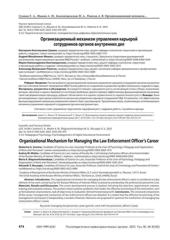 Рассматривается организационный механизм управления карьерой сотрудников органов внутренних дел как ключевой элемент проводимой МВД России работы по сохранению и развитию профессионального кадрового ядра. Материалы, результаты и обсуждение. Исследуется процесс карьерного роста, включающий этапы отбора, назначения, ротации, обучения и оценки. Выявляются системные проблемы, препятствующие эффективному функционированию механизма, такие как формализация процедур, дефицит объективности в оценке, ограниченность горизонтального роста. Выводы. Были детализированы структурные компоненты механизма управления карьерой сотрудников ОВД. Установлено, что эффективному функционированию механизма управления препятствует ряд барьеров. Предложены меры, позволяющие оптимизировать механизм управления карьерой сотрудников органов внутренних дел.
