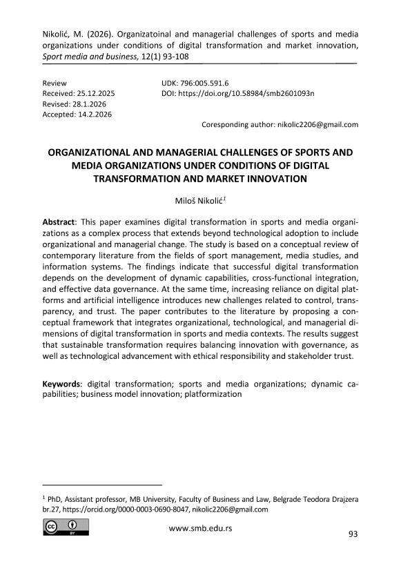 This paper examines digital transformation in sports and media organizations as a complex process that extends beyond technological adoption to include organizational and managerial change. The study is based on a conceptual review of contemporary literature from the fields of sport management, media studies, and information systems. The findings indicate that successful digital transformation depends on the development of dynamic capabilities, cross-functional integration, and effective data governance. At the same time, increasing reliance on digital platforms and artificial intelligence introduces new challenges related to control, transparency, and trust. The paper contributes to the literature by proposing a conceptual framework that integrates organizational, technological, and managerial dimensions of digital transformation in sports and media contexts. The results suggest that sustainable transformation requires balancing innovation with governance, as well as technological advancement with ethical responsibility and stakeholder trust.