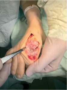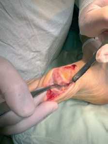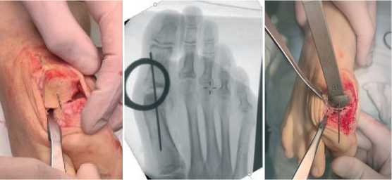 Положение пациента — на спине. Производится трёхкратная обработка операционного поля растворами антисептиков. Медиальным доступом выполняется артротомия первого плюснефалангового сустава (рис. 2).