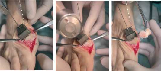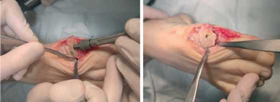 Рис. 3. Резекция суставной поверхности головки первой плюсневой кости с помощью резекционного блока Fig. 3. Resection of the articular surface of the head of the first metatarsal bone using a filing block