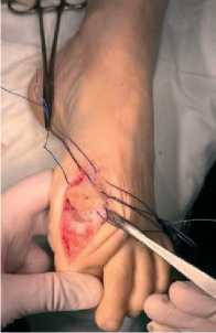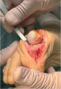 1 ПФС после гемиэндопротезирования 1 ПФС и пластики плюсне-сесамовидного сустава коллагеновой мембраной Fig. 7 . Intraoperative assessment of the range of motion of the 1 MTP joint after hemiendoprosthetics of the 1 MTP joint and plastic surgery of the metatarso-sesamoid joint with a collagen membrane
