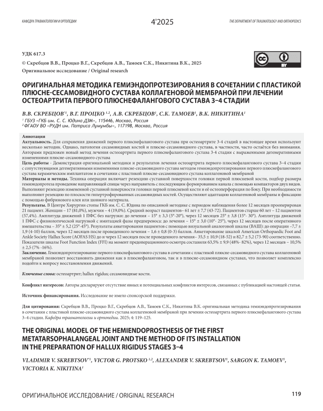 Оригинальная методика гемиэндопротезирования в сочетании с пластикой плюсне-сесамовидного сустава коллагеновой мембраной при лечении остеоартрита первого плюснефалангового сустава 3–4 стадии