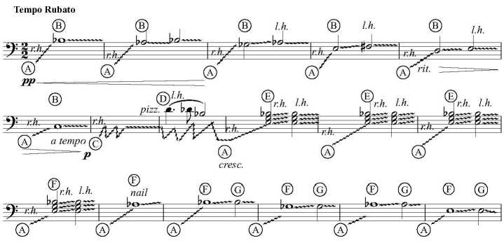 Рис. 1. Пример отображения приемов звукоизвлечения на рояле в нотной графике