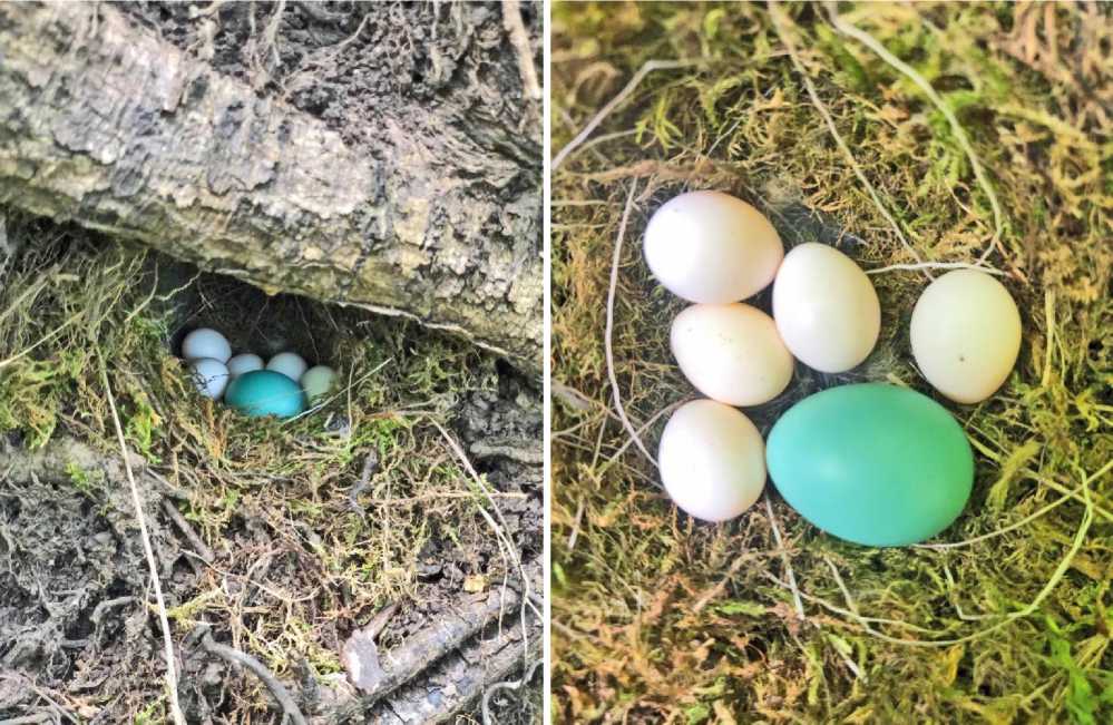 (Бачурин 2003). В 1997-2022 годах мы нашли только 3 яйца: 2 в гнёздах зарянки Erithacus rubecula и 1 в гнезде камышовой овсянки Schoeniclus schoeniclus . Все 3 яйца были расы зяблика/юрка. Четвёртое яйцо кукушки найдено 6 июня 2025 в лесу на окраине Кирова в гнезде зелёной пеночки Phylloscopus trochiloides с 5 её яйцами (рис. 12). Гнездо располагалось в корнях елового выворотня в 35 см от земли. Яйцо кукушки, в отличие от белых яиц пеночки, было ярко-бирюзовым, скорее всего, расы лугового чекана или обыкновенной горихвостки.
