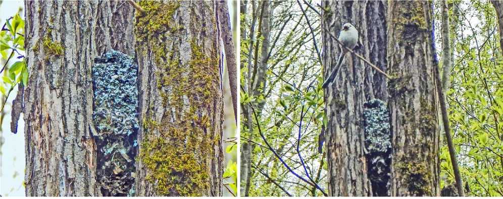 Ополовник Aegithalos caudatus. На окраине Кирова в пойменном ольхово-черёмухово-ивовом лесу 13 мая 2024 мы нашли гнездо ополов-ника. Построено оно на высоте 2.5-2.7 м между трёх стволов (стоят очень плотно) сухой ивы. Вход в гнездо (леток) сверху (рис. 13). Наблюдение показало, что в гнезде уже птенцы, которых кормили три ополовника – 1 самка и 2 самца (рис. 13). Такое поведение хорошо известно и обычно объясняется «помощничеством». Птицы носили корм птенцам, не обращая внимания на человека, стоящего в 5-6 м от гнезда.