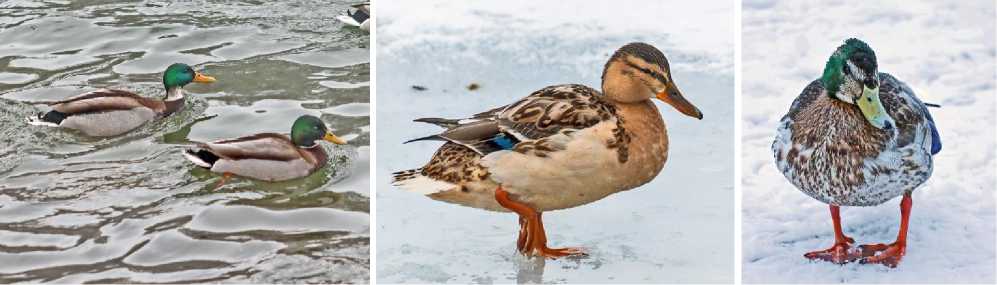 Кряква Anas platyrhynchos . С начала 1980-х годов в Кирове стала формироваться зимующая популяция крякв. Сначала это были десятки уток, затем сотни, сейчас – тысячи (в 2022 году – 2867 особей, в 2023 – 3012, в 2024 – 3247, в 2025 – 4202) (Сотников 1999; Анисимов и др. 2025). Большинство этих птиц зимует на двух прудах в парке им. С.М.Кирова в центре города. Зимой верхний пруд с родниковым питанием не замерзает, а на нижнем остаются небольшие полыньи. При таком скоплении крякв там почти ежегодно наблюдаются птицы с различными отклонениями в окраске оперения. В этом сообщении расскажем только о последних встречах. Самец кряквы с проявлением частичного лейцизма встречен 17 февраля 2025. От самцов с типичной окраской он отличался широким белым ошейником (рис. 15). На том же пруду самку-лейциста наблюдали с 12 декабря 2024 по 17 февраля 2025 (рис. 16). В январе 2025 года в разных районах Кирова несколько орнитологов наблюдали крякву с необычной окраской. Она была непуглива, держалась не только на водоёмах, но и прилетала на подкормочные площадки на оживлённых улицах. По окраске оперения было трудно сказать, самец это или самка. На груди, боках тела, брюхе в разном сочетании были перья обоих половых нарядов. Верх головы, щёки, затылок окрашены в блестящий зелёный цвет, характерный для самца, но уздечка, горло, брови оставались пёстрыми, как у самки (рис. 17). Ю.Н.Глущенко, посмотрев фотографии этой кряквы, дал комментарий: «на первый взгляд кажется, что всё дело в проблеме с фрагментарной блокировкой линьки. Но нет… Центральные рулевые слегка скрючены. Даже если они не доросли – они, вероятно, не смогут закрутиться как у типичного самца. Получается некая химерная куропёрость, размещённая хаотично в виде отдельных блоков разного размера. В любом случае экземпляр вызывает особый интерес».