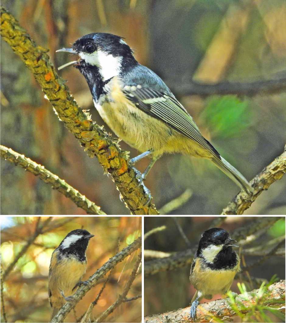Московка Periparus ater. В окрестностях Малмыжа (Косинский лес) 28 сентября 2024 встречена стайка московок, в которой брюхо у всех птиц было не грязно-белое, а жёлтое (Сотников и др. 2025). Интересно, что почти в том же месте (у деревни Новая Смаиль) 24 августа 2025 встречена стайка (семья?) из 5-6 московок, у 2 птиц окраска брюха и боков тела была обычной, а у 3-4 ярко-жёлтой, даже ещё более интенсивной, чем в 2024 году (рис. 21). Синицы перемещались в молодых сосновых посадках. Мы побывали там 30 августа, встретили эту группу, в которой успели разглядеть двух желтобрюхих. На фотографиях видно, что слабый жёлтый цвет заметен и на белых щеках. В окрестностях Мал - мыжа в том же Косинском лесу 8 сентября и 18 октября 2025 наблюдалась стайка примерно из 10 московок, 2 из них были с желтоватым низом, но не таким ярким, как в августе. Эта аберрация связана с усилением липохромной окраски в локальной популяции.
