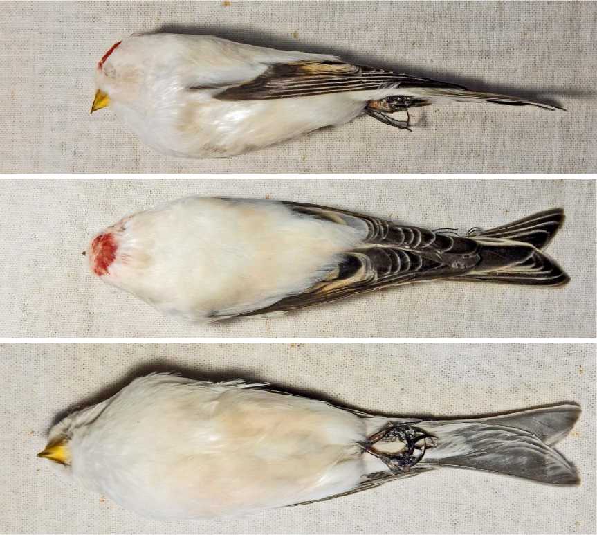 Чечётка Acanthis flammea . На пустыре у деревни Бобровы в Даров-ском районе 30 ноября 2024 в стае чечёток была замечена птица белого цвета, 1 декабря поймана. У чечётки голова, спина, горло, грудь, брюхо, бока тела были снежно-белые с едва заметным охристым налётом на некоторых участках. На лбу была маленькая красноватая шапочка. Типичная «чечёточья» черновато-бурая окраска сохранялась только на крыльях и хвосте (рис. 24).